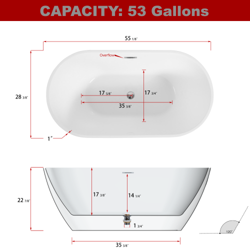 Elevate your bathroom to new levels of luxury with this 55-inch freestanding acrylic bathtub. Constructed with premium acrylic material, this bathtub is not only durable but also boasts a high-gloss finish that is easy to clean and maintain. The generous 55-inch size provides ample room for a comfortable soak and can accommodate various body types. The modern, yet timeless design with clean lines and a sleek silhouette is perfect for contemporary bathroom decors. The bathtub features a brushed nickel-finished overflow and drain that adds a sophisticated accent while preventing corrosion. Its freestanding design enables easy installation and placement in any bathroom layout. This bathtub is also certified to meet North American safety and quality standards. Thanks to its non-porous surface, this bathtub resists stains and scratches, ensuring long-lasting beauty. Whether you're looking to unwind after a long day or elevate your bathroom decor, this 55-inch freestanding acrylic bathtub is a perfect choice.